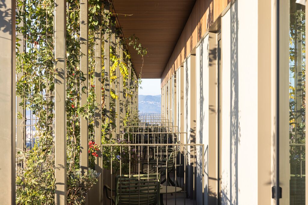 De otro lado, en la parte superior, las palas verticales se conectan con vigas metálicas para formar una gran pérgola para la instalación de paneles fotovoltaicos.