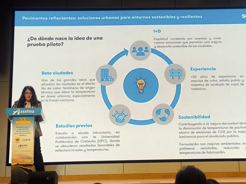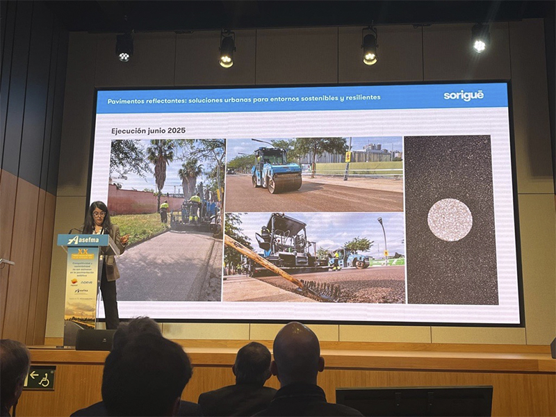 Durante la XX jornada anual de la Asociación española de fabricantes de mezclas asfálticas, Sorigué pudo explicar el impacto de sus pavimentos con propiedades reflectantes para mitigar el calor en zonas urbanas.