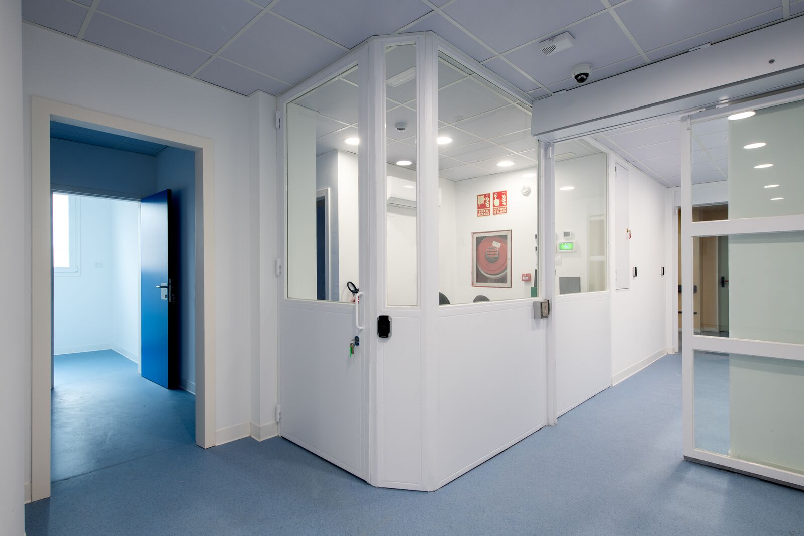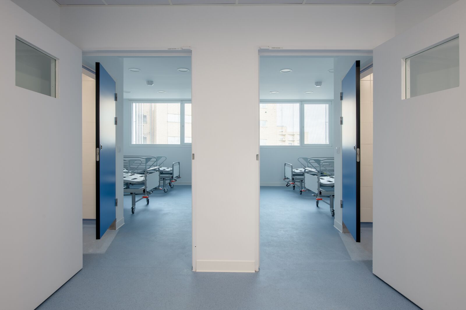 La zona de hospitalización se ubica en la planta segunda del edificio de traumatología y cuenta con cuatro habitaciones dobles con baño, un área de control para agentes de seguridad, una esclusa de acceso y espacios auxiliares como vestuarios y zonas de descanso para el personal penitenciario.